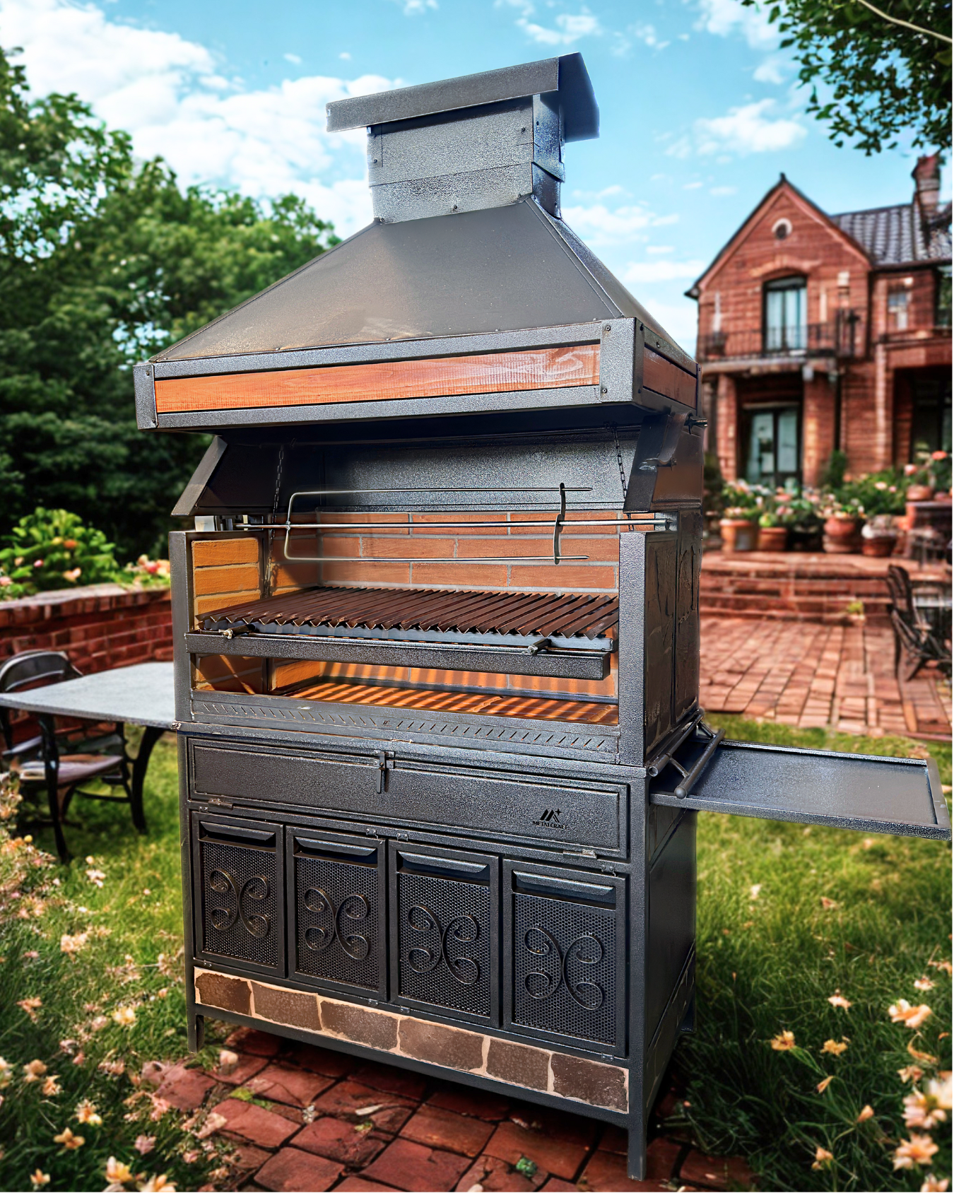 Incluye parrilla desmontable con ángulo "V", bandeja lateral desplegable, cajonera de almacenamiento y un espiedo con motor de 10 kg. Su diseño robusto y su campana metálica la hacen perfecta para quienes viven el asado como una experiencia completa.